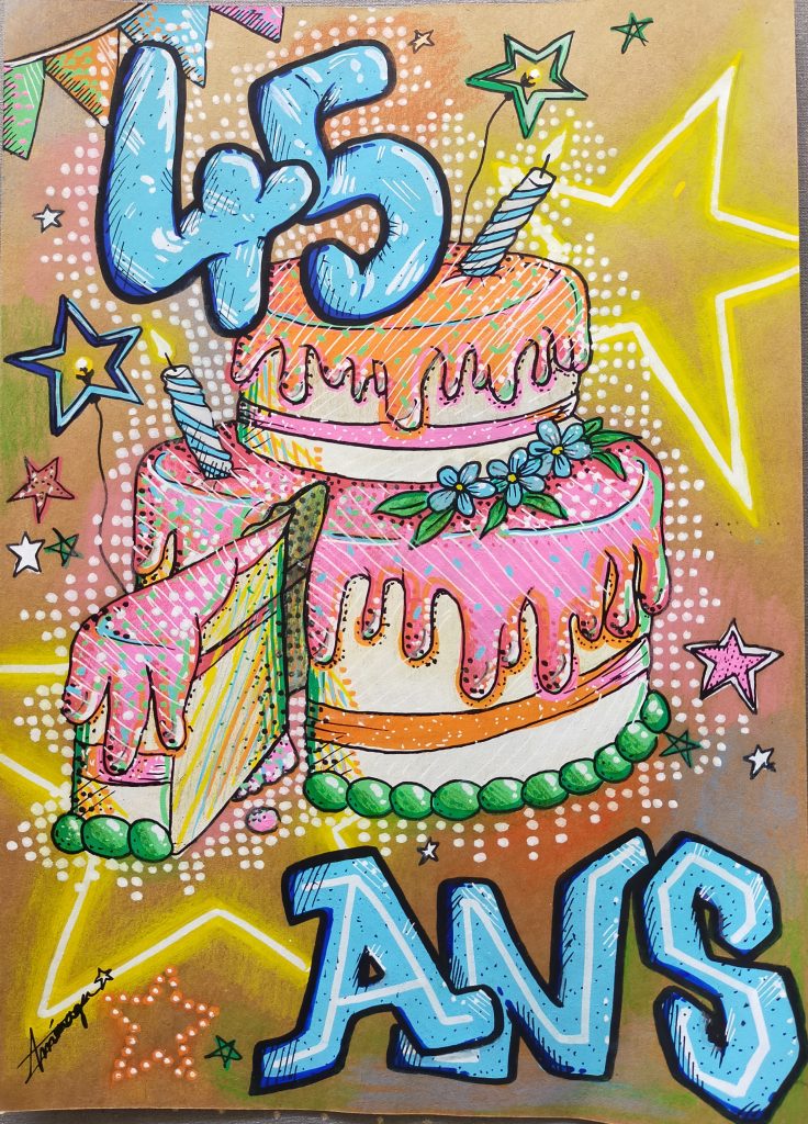 J’ai dessiné un gâteau d’anniversaire en « pop art », un mouvement artistique où les couleurs vives et les collages sont beaucoup utilisés.