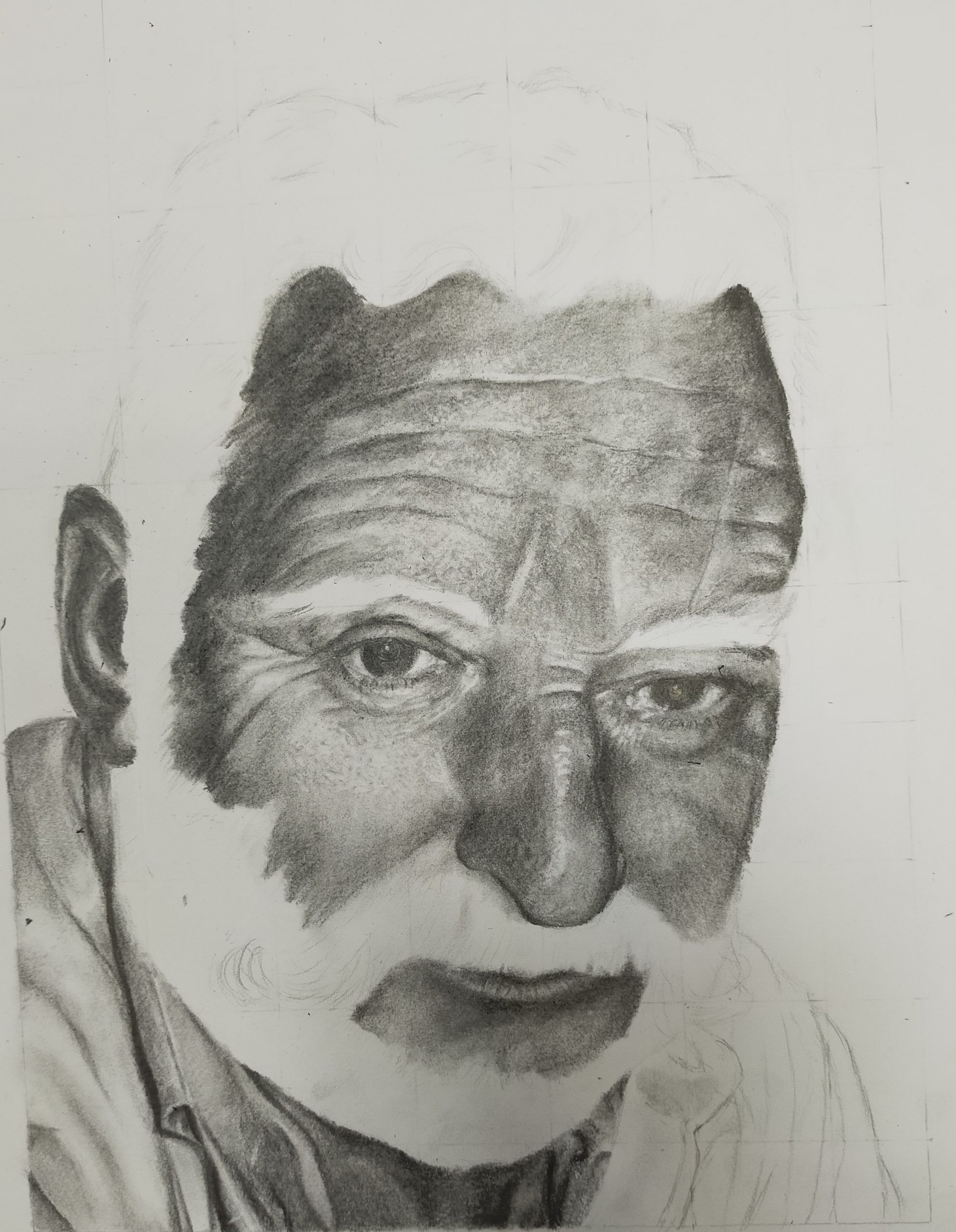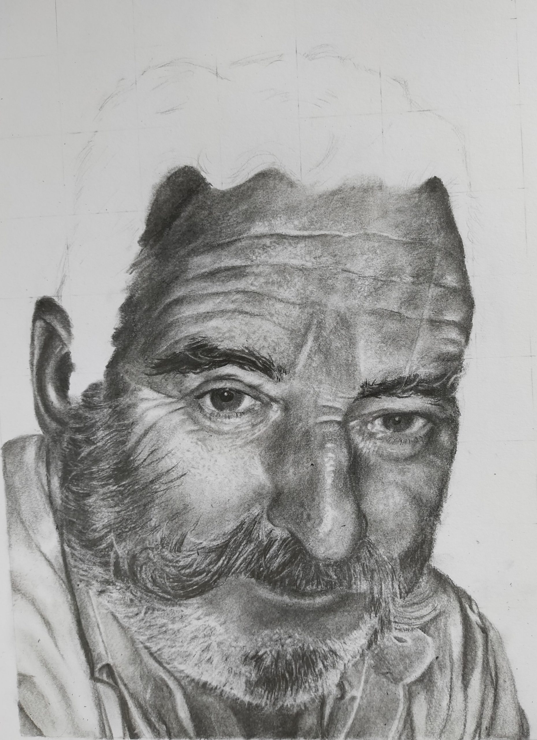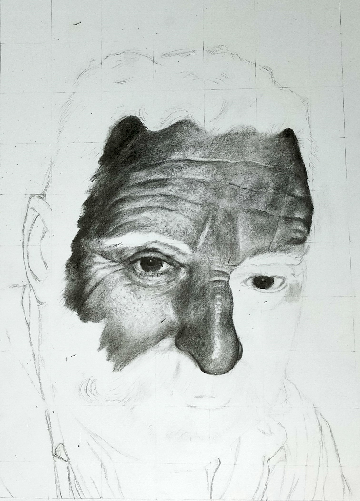J’ai dessiné mon grand-père avec de la mine de plomb. Elle s’utilise comme le crayon de papier avec l’aide d’estompes. Voici les différentes étapes…