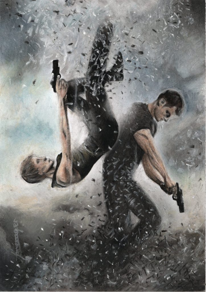 J’ai dessiné Tris et Quatre, les deux personnages principaux de la trilogie « Divergente » (joués par Shailene Woodley et Théo James), adapté en film d’après les romans de Veronica Roth (personnellement, j’ai adoré les livre et les films même si je trouve que le dernier est moins fidèle au livre). Pour cela, j’ai utilisé mes pastels Faber-Castell.